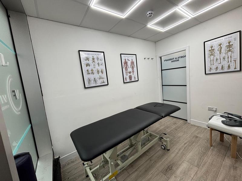 A bright and private treatment room located inside our Fitness & Wellness Centre in Canary Wharf (E14). The space is fully equipped with a treatment couch, sink, desk, and chairs, making it ideal for massage therapists, physiotherapists, osteopaths, acupuncturists, or other wellness practitioners.