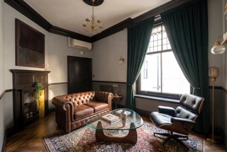 Inside the consulting room, it’s classic Mayfair, intimate and beautifully composed. High ceilings with deep timber cornicing, a chandelier and warm wall lights, rich panelling, and a statement fireplace set the tone. Premium seating includes a leather Chesterfield and an executive Eames lounge chair, anchored by a sculptural glass table on parquet flooring and a patterned rug. Heavy emerald curtains and privacy treatments create a cocooned atmosphere, with full control over light, mood, and discretion. The room sits alongside other medical practitioners in a quieter section of the building, where privacy and professionalism are the default.